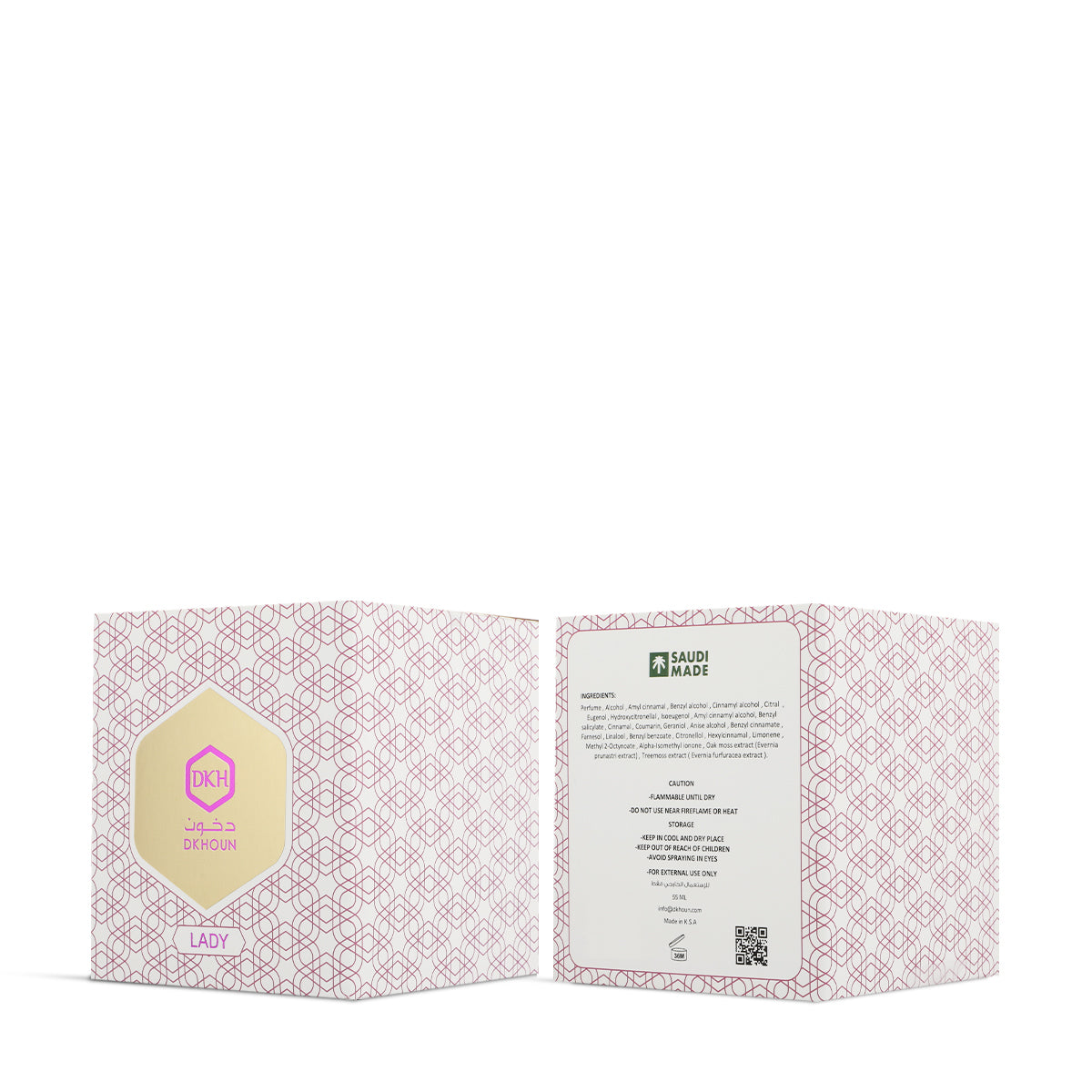 عطر **ليدي** يتميز بتوليفة أنثوية ساحرة تمزج بين النوتات الفاكهية، الزهرية والخشبية لتقديم تجربة عطرية فريدة